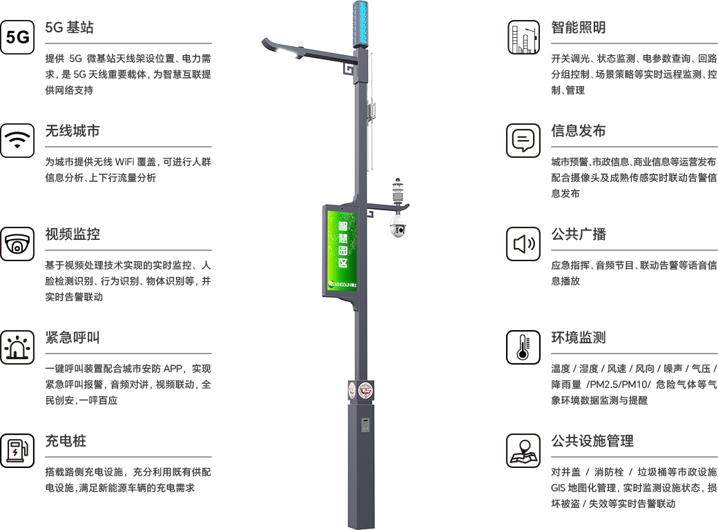 | 智慧鄉村數字杆 | 标準高度6米(可定制),青磚灰,Q355材質内外熱鍍鋅+表面噴塑,含造型燈殼、5G法蘭、顯示屏支架、攝像頭支架、底座内部設備固定支架。60W+裝飾燈 |