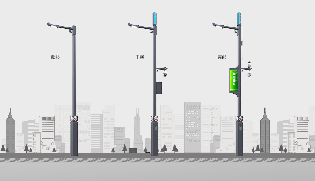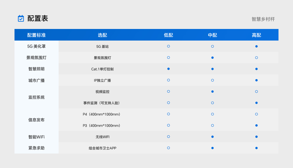 | 智慧鄉村數字杆 | 标準高度6米(可定制),青磚灰,Q355材質内外熱鍍鋅+表面噴塑,含造型燈殼、5G法蘭、顯示屏支架、攝像頭支架、底座内部設備固定支架。60W+裝飾燈 |